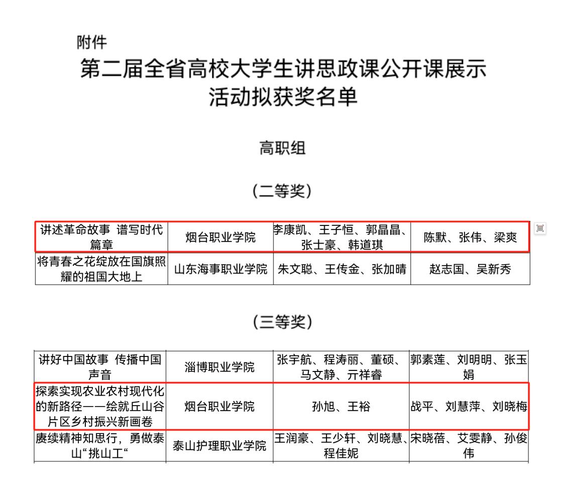 日前,山东省教育厅(省委教育工委)公布了第二届全省高校大学生讲思政课公开课展示活动获奖名单,烟职学子获高职组二等奖、三等奖。