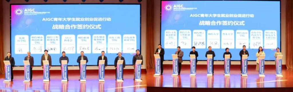 会上举行了“AIGC成果转化与应用中心”揭牌仪式,执委会与15所驻烟高校有关负责人进行签约,并举行AIGC行动作品征集大赛启动仪式。